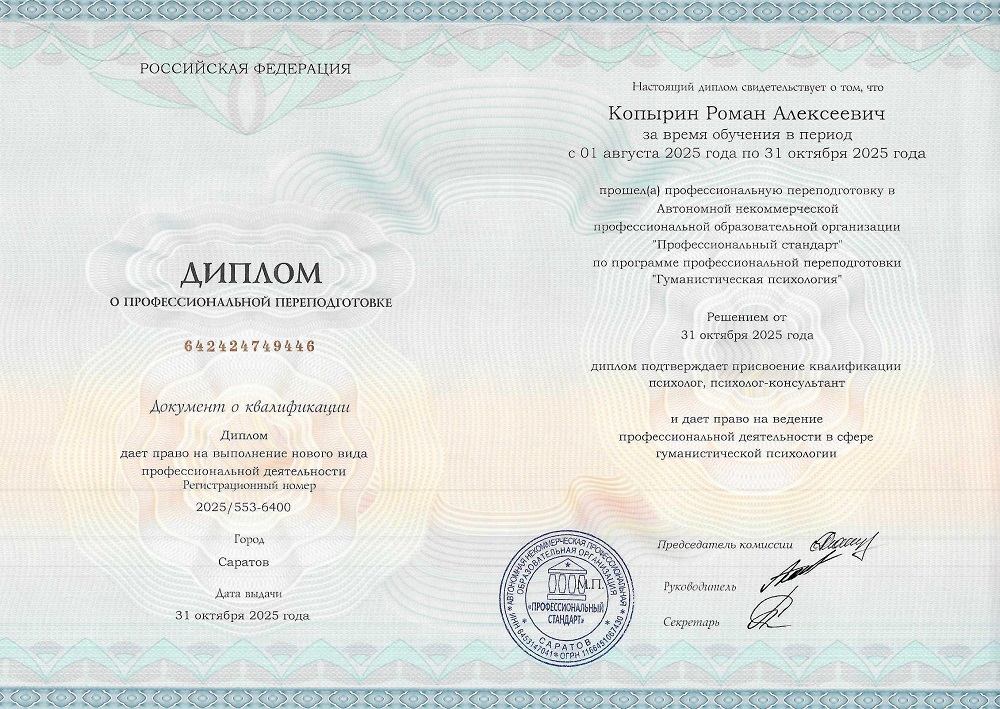 В результате обучения вы получаете диплом о профессиональной переподготовке установленного образца, который даёт право на ведение профессиональной деятельности.